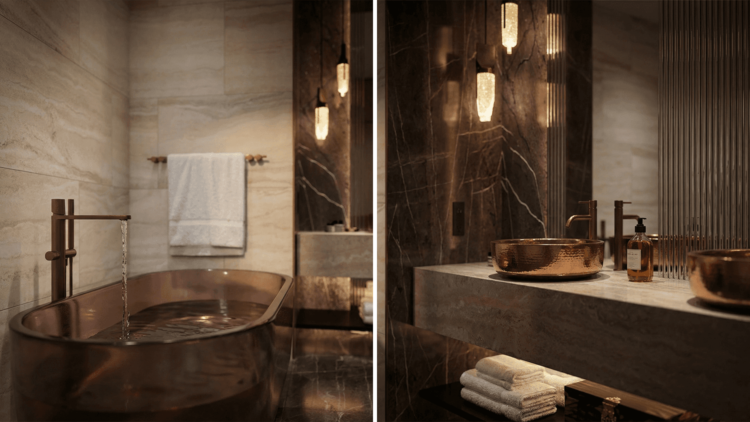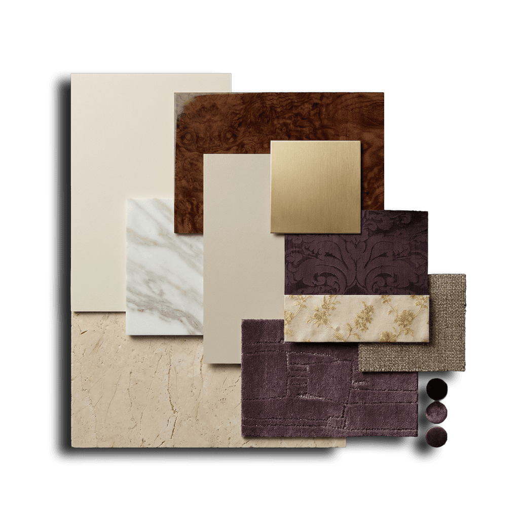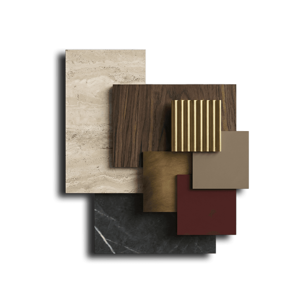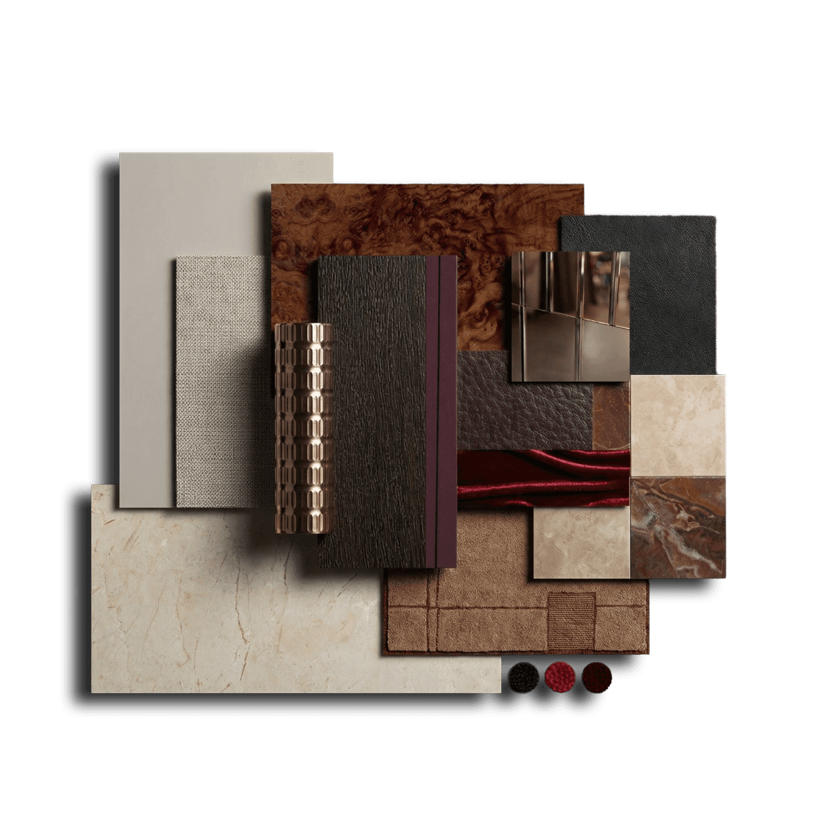 The first design is inspired by classic watchmaking and the shapes found in Qatar Museums. Bordeaux marble, leather details, and metal accents give a sense of precision and control. The mood feels confident and grounded, both modern and timeless.