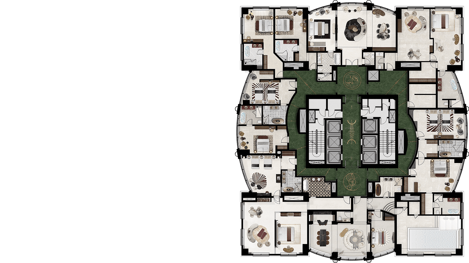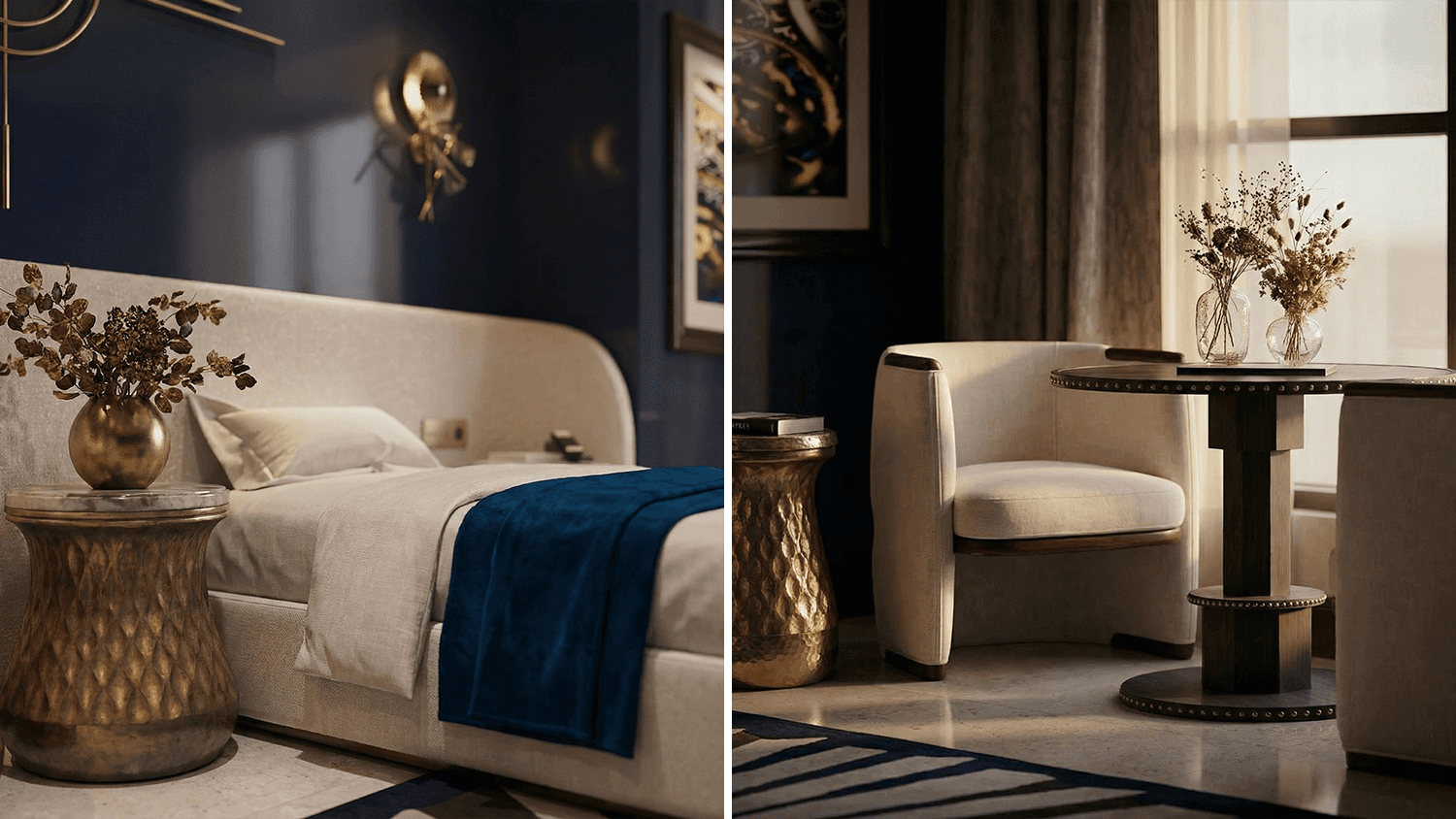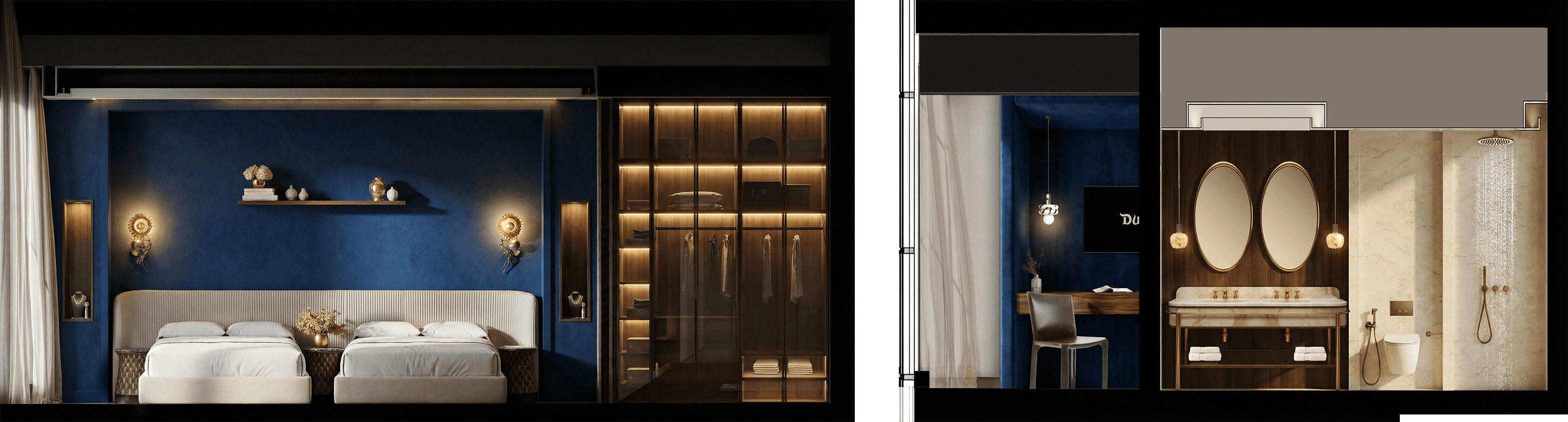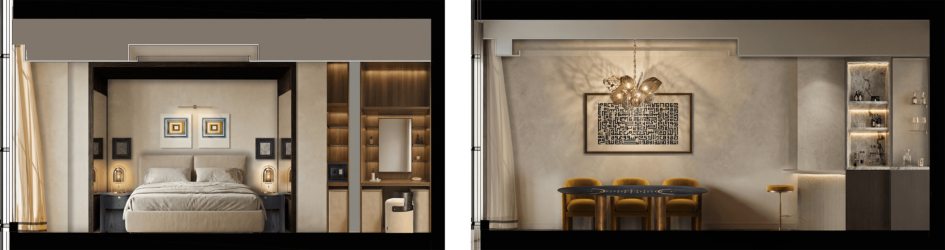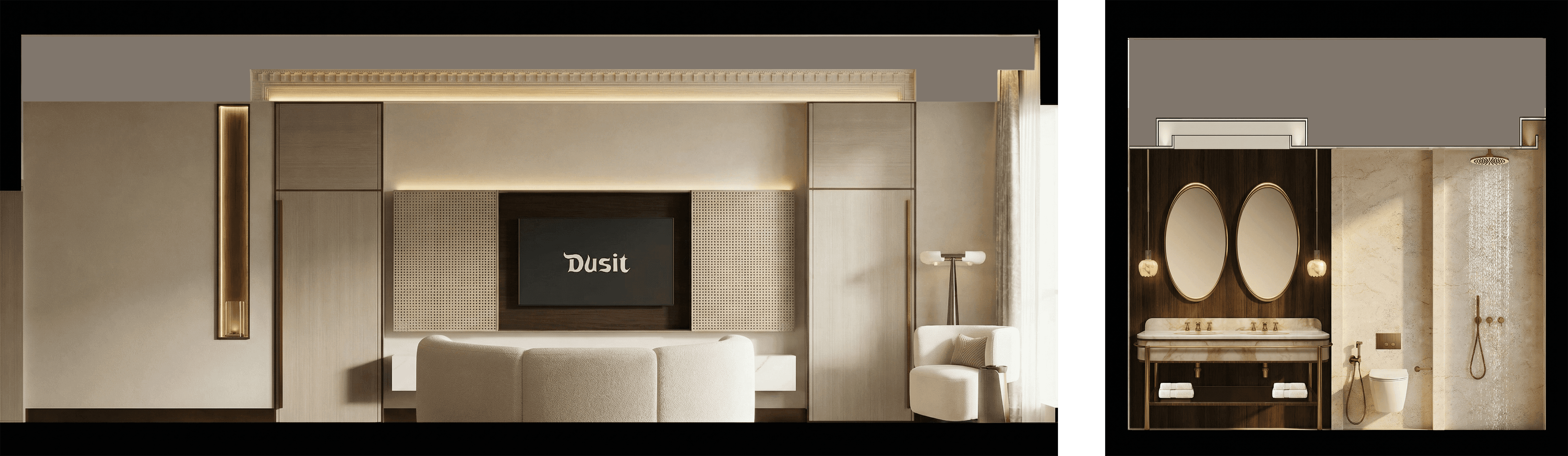 To turn the existing apartments into Dusit guestrooms and suites, we created four interior stories. Each one is inspired by watchmaking and Qatar’s architecture and culture. Together, they explore ideas of time, materials, and place.